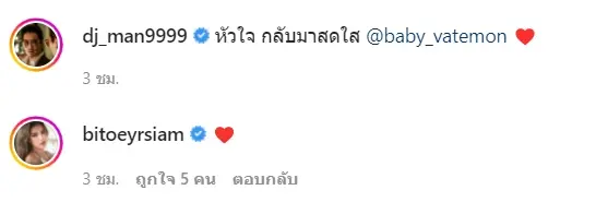 ล่าสุด ดีเจแมน ได้มีการอัปเดตอาการของ น้องเวทย์มน อีกครั้ง โดยเผยภาพความสดใสของลูกสาว พร้อมข้อความว่า หัวใจ กลับมาสดใส โดยมี ใบเตย อาร์สยาม เข้ามาคอมเมนต์ส่งอิโมจิรูปหัวใจใต้โพสต์