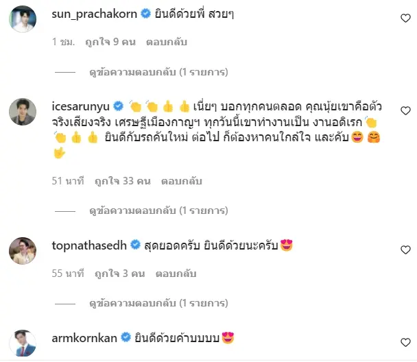 งานนี้ก็ได้มีการอวดภาพคู่กับรถคันใหม่ พร้อมหน้าพร้อมตาครอบครัว โดยมีเพื่อนๆร่วมวงการ และ บรรดาแฟนๆเข้ามาร่วมแสดงความยินดีกันอย่างมากมาย อาทิเช่น นิวเคลียร์ หรรษา , นิกกี้ ณฉัตร , ม่อน ธนัชชัย , ดีเจบุ๊กโกะ , ดีเจมะตูม และ อื่นๆ