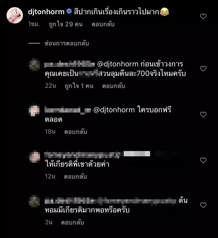 ซึ่ง ดีเจต้นหอม นั้น ได้มีการคอมเมนต์ว่า “สีปากเกินเรื่องเกินราวไปมาก” พร้อมกับแปะอิโมจิรูปหัวเราะจนน้ำตาไหล แต่ดันมีชาวเน็ตไม่ประสงค์ดี เข้ามาคอมเมนต์ต่อจากโพสต์ของ ดีเจต้นหอม ทันทีว่า “ก่อนเข้าวงการคุณเคยเป็นกะ…สวนลุม คืนละ 700 จริงไหมครับ”