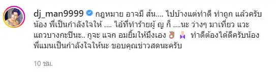 ล่าสุด ดีเจแมน พัฒนพล สามีของนักร้องสาว ใบเตย อาร์สยาม ก็ได้ออกมาโพสต์ข้อความผ่านอินสตราแกรมส่วนตัวว่า กฎหมาย อาจมี ส้น…. ไปบ้างแต่ทำดี ทำถูก แล้วครับน้อง พี่เป็นกำลังใจให้ …. ไอ้ที่ทำร้ายผู้ ญ ก็ ….นะ ว่างๆ มาเที่ยว แวะ แถวบางกะปินะ.. กูจะ แจก อมยิ้มให้มึงเอง👌🏽🙏🏻 ทำดีต้องได้ดีครับน้อง พี่แมนเป็นกำลังใจให้นะ ท่ามกลางแฟนคลับที่เข้ามาคอมเมนต์อย่างมากมาย บอกว่าทั้งที่เข้าไปช่วยแท้ ๆ