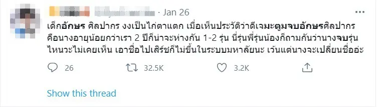 จากนั้นก็ได้มีชาวเน็ตรายหนึ่งออกมาโพสต์ถามว่า “มะตูมจบอักษรฯ ศิลปากรรุ่นไหนหรอคะ ลองถามหลายๆคนก็ไม่มีใครรู้จักเลยอะ ใน reg ก็ไม่มีชื่อขึ้น #ดีเจมะตูม”