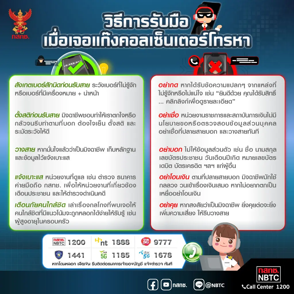 ทางด้าน สำนักงานคณะกรรมการกิจการกระจายเสียงกิจการโทรทัศน์และกิจการโทรคมนาคมแห่งชาติ (กสทช.) ก็ได้ออกมาแนะนำวิธีรับมือ แก๊งคอลเซ็นเตอร์ รู้ทันมิจฉาชีพ หลังเปลี่ยนรูปแบบการหลอกโอนเงินตลอดเวลา