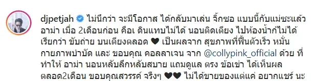 ล่าสุดก็เป็นข่าวดีให้กับทางครอบครัวของ ดีเจเพชรจ้า ได้กลับมาชื่นใจอีกครั้ง หลังจากที่คุณแม่ของเจ้าตัว ที่ก่อนหน้านี้ได้ล้มป่วยจนถึงขั้นเข้าโรงพยาบาล เป็นผู้ป่วยติดเตียงอยู่ 2 เดือน ตอนนี้สามารถกลับมานั่งเล่นของเล่น เล่นต่อจิ๊กซอว์กับลูกๆ หลานๆ ได้แล้ว ทำเอาทางด้านของดีเจเพชรจ้าถึงกับเผยว่า นึกไม่ถึงว่าจะมีโอกาสนี้เกิดขึ้น