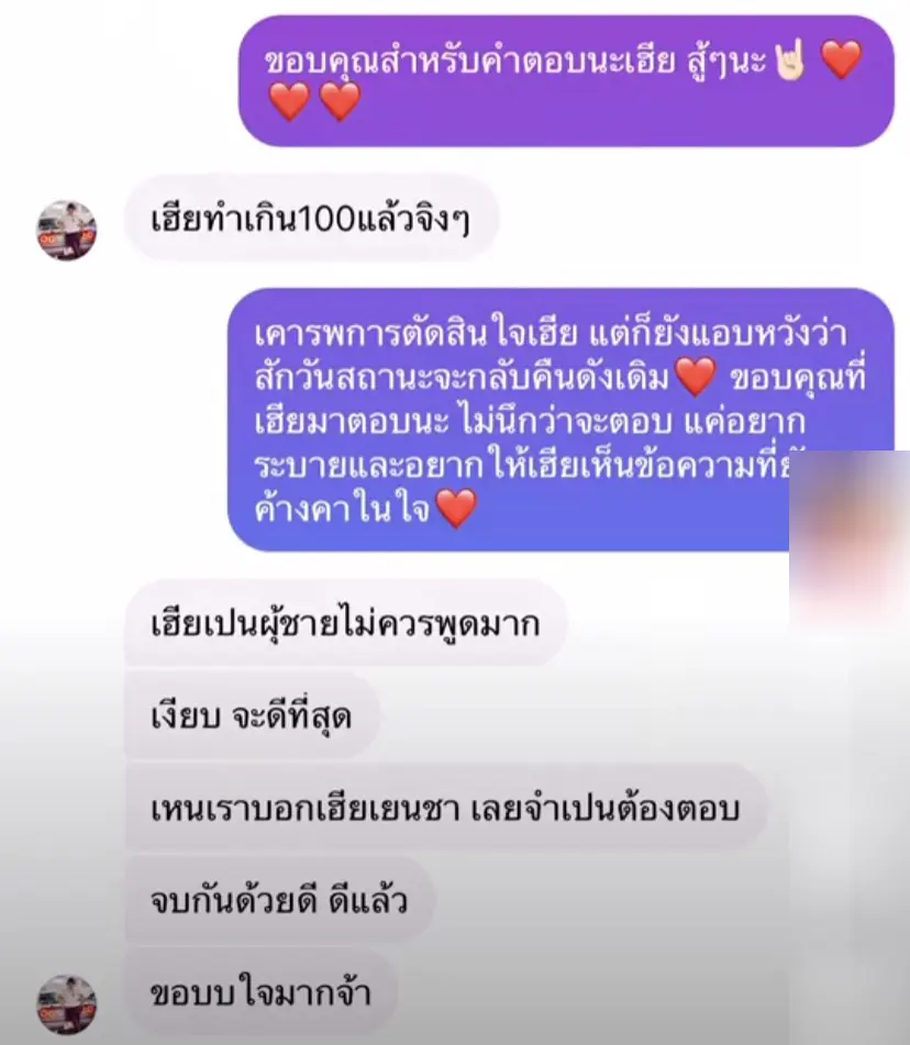 FC : เคารพการตัดสินใจของเฮีย แต่ก็ยังแอบหวัง สักวันสถานะจะกลับคืนดังเดิม ขอบคุณที่เฮียมาตอบนะ ไม่นึกว่าจะตอบ แค่อยากระบายและอยากให้เฮียเห็นข้อความที่ยังค้างคาในใจ