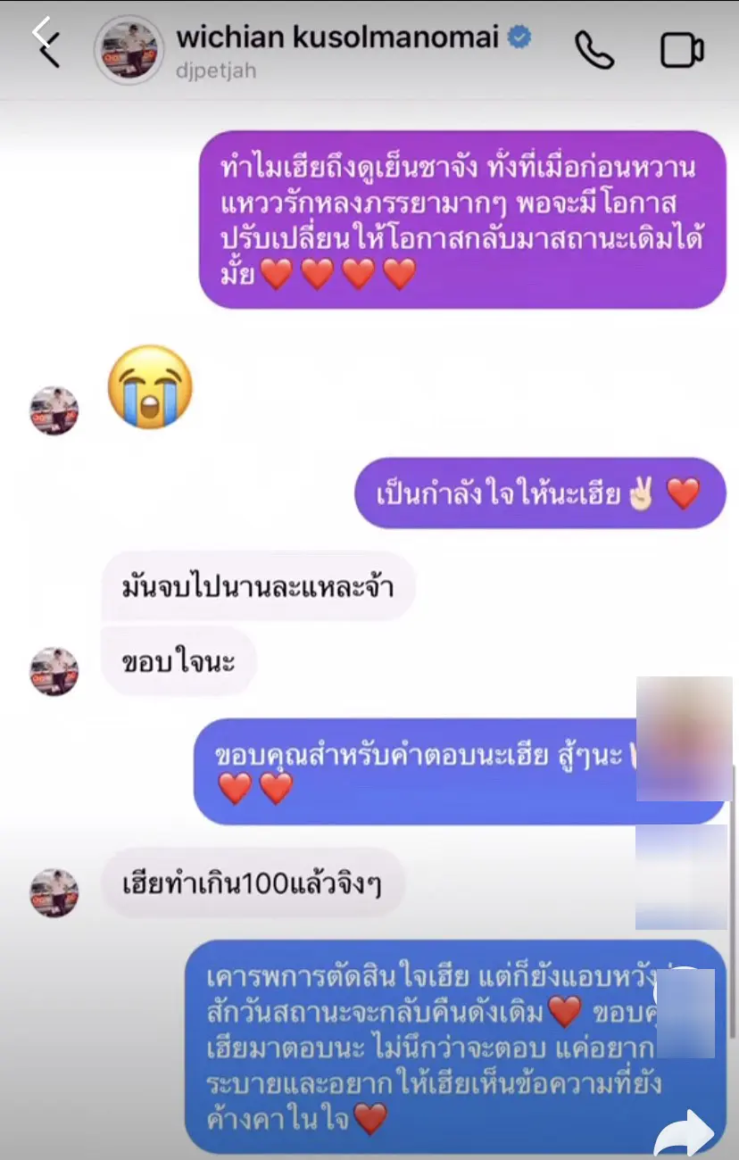ล่าสุด ได้มีแฟนคลับรายหนึ่งแคปข้อความแชทที่เข้าไปคุยกับดีเจเพชรจ้าทางอินสตาแกรมว่า
