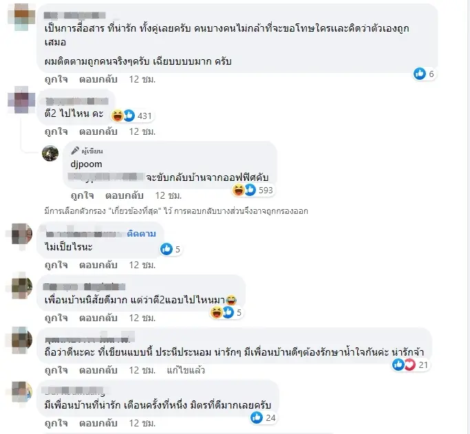 ซึ่งหลังจากที่ดีเจภูมินำจดหมายของเพื่อแสดงเจตจำนงค์ที่จะขอโทษของตัวเอง ก็มีหลาย ๆ คนเข้ามาคอมเมนต์ชื่นชมในความน่ารักของเพื่อนบ้านคนนี้ ที่ใช้ถ้อยคำได้สุภาพในทุกคำที่เขียนมา และก็ชื่นชมทางด้านของ ดีเจภูมิ ที่รู้ตัวว่าผิดก็ออกมายอมรับผิดแลขอโทษเพื่อนบ้านคนนี้ พร้อมทั้งชี้แจงว่า เหตุที่ต้องสตาร์ทเสียงดังตอนตี2 เพราะจะต้องเดินทางจากออฟฟิศของตัวเองกับมาที่บ้าน