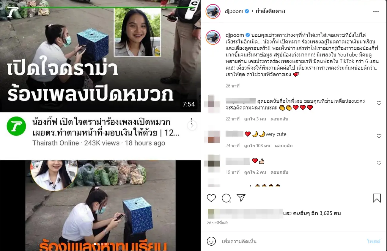 ดีเจภูมิ อาสาเป็นป๋าดัน ส่งทีมงานติดต่อ น้องกิ๊ฟ นักศึกษาเพลงเปิดหมวกหาเงินส่งตัวเองเรียน สุดช็อก! โปรไฟล์อดีตแชมป์ร้องเพลงรายการดัง คนตามTiktokกว่า6แสน เผย! มาทำเพลงร่วมกัน ออกค่าใช้จ่ายให้ทั้งหมด