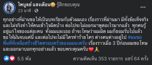 ไพบูลย์ แสงเดือน สามี กระต่าย ออกมาโพสต์ร่ายยาวขอให้ทุกอย่างเป็นบทเรียน ยอมรับผิด ต่อไปจะไม่พูดอะไรอีกแล้ว เรื่อง 3 ปีก่อนขอโทษ