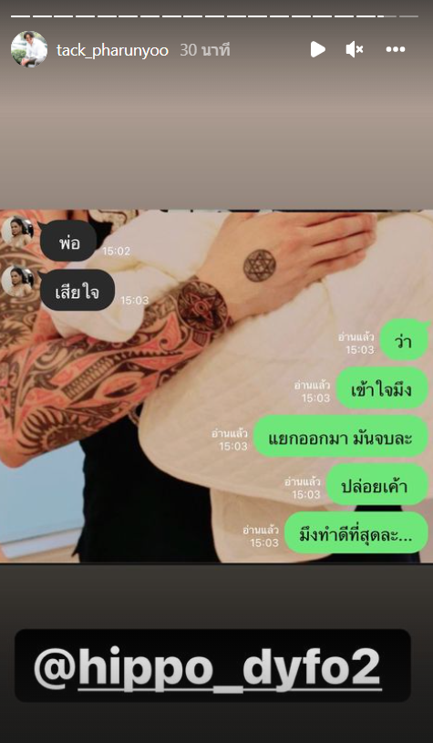 ล่าสุด ฮิปโป เคลื่อนไหวหลัง แทค ภรัณยู ได้โพสต์ภาพแชท ฮิปโป ทักหาหลังโหนกระแสจบ โดยฮิปโปบอกว่าเสียใจ ก่อนที่แทคจะบอกกลับไปว่า เข้าใจมึง แยกออกมามันจบละ ปล่อยเค้า มึงทำดีที่สุดแล้ว
