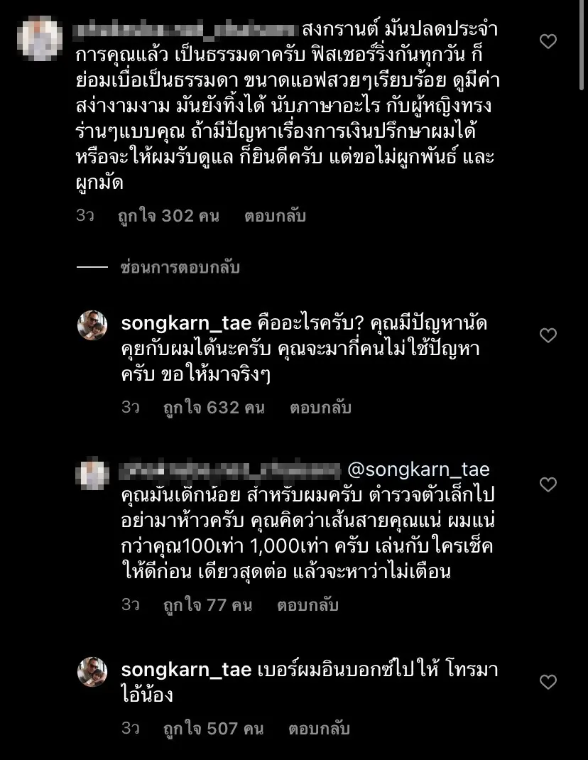 ต่อมาด้านแฟนหนุ่ม สงกรานต์ เตชะณรงค์ ก็ได้มีการเข้ามาโพสต์ข้อความปกป้องว่า “คืออะไรครับ? คุณมีปัญหานัดคุยกับผมได้นะครับ คุณจะมากี่คนไม่ใช้ปัญหาครับ ขอให้มาจริงๆ” , “เบอร์ผมอินบอกซ์ไปให้ โทรมาไอ้น้อง”
