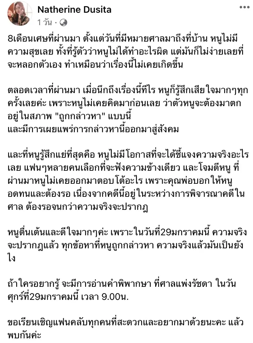 ล่าสุด แนทเธอรีน ได้มีการโพสต์ข้อความร่ายยาว ผ่านเฟซบุ๊ก Natherine Dusita ว่า “8 เดือนเศษที่ผ่านมา ตั้งแต่วันที่มีหมายศาลมาถึงที่บ้าน หนูไม่มีความสุขเลย ทั้งที่รู้ตัวว่าหนูไม่ได้ทำอะไรผิด แต่มันก็ไม่ง่ายเลยที่จะหลอกตัวเอง ทำเหมือนว่าเรื่องนี้ไม่เคยเกิดขึ้น ตลอดเวลาที่ผ่านมา เมื่อนึกถึงเรื่องนีไร หนูก็รู้สึกเสียใจมากๆทุกครั้งเลยค่ะ เพราะหนูไม่เคยคิดมาก่อนเลย ว่าตัวหนูจะต้องมาตกอยู่ในสภาพ “ถูกกล่าวหา” แบบนี้ และมีการเผยแพร่การกล่าวหานี้ออกมาสู่สังคม