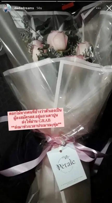 นอกจากนี้ ดรีมแฟนเสือ ยังได้มีการโพสต์ภาพช่อดอกไม้ ระบุว่า ดอกไม้จากคนที่อ้างว่าตัวเองเป็น ผู้ลงสมัครสส.อยู่แถวเตาปูน ส่งให้ผ่าน GRAB **ส่งมาช่วงเวลาประมาณ 5 ทุ่ม**