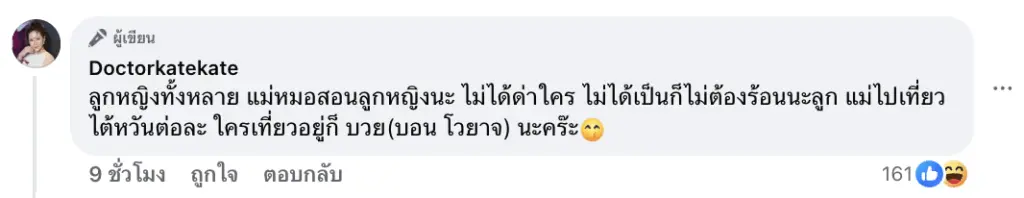 “ทำชีวิตให้ดีก่อน ให้ตัวเองมีค่า ไม่ต้องแก้ผ้าเต้นเด้าบดแลกเศษเงิน ค่อยคิดจะสอนคนอื่นหรือให้บทเรียนสังคมค่ะ นี่คือคำที่ชั้นสอนลูกหญิงเสมอ”