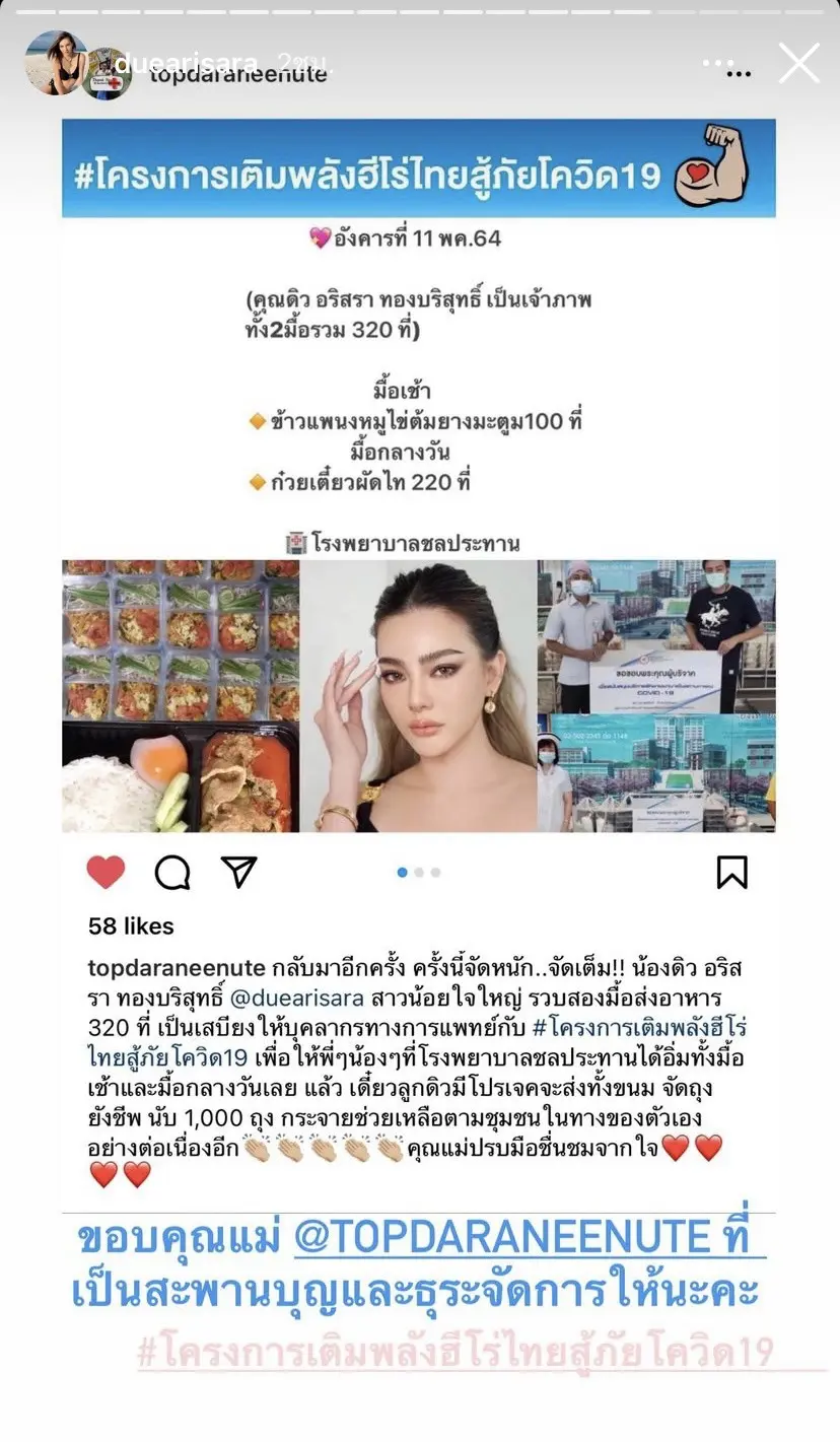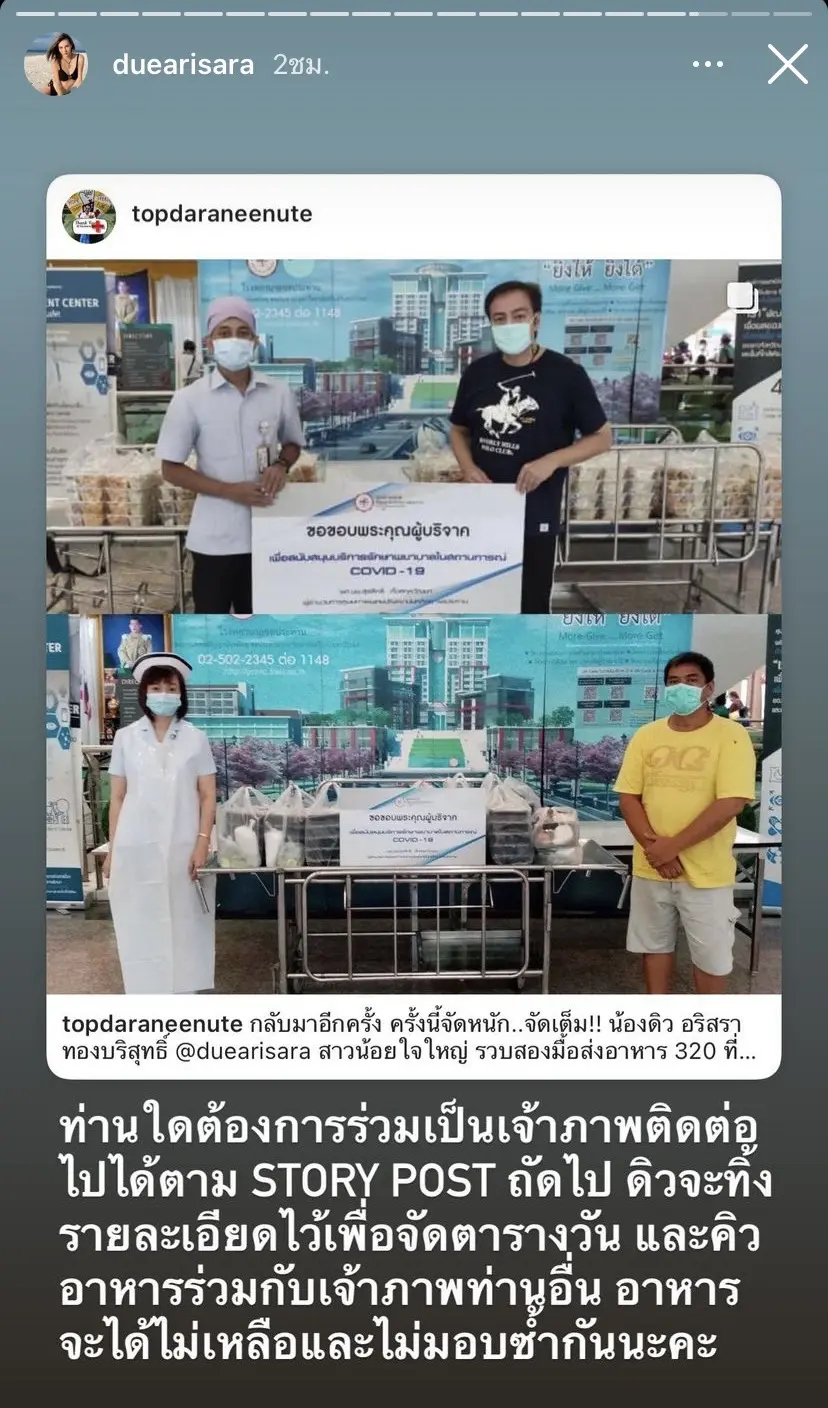 ก่อนหน้านี้ ดิว อริสรา ได้มีการแบ่งเบาความเหนื่อยล้าของทีมแพทย์ด้วยการส่งนมฮอกไกโด ให้กับสถาบันบำราศนราดูร จำนวน 120 ขวด เพื่อเป็นกำลังใจในการช่วยเหลือผู้ป่วยโควิด19