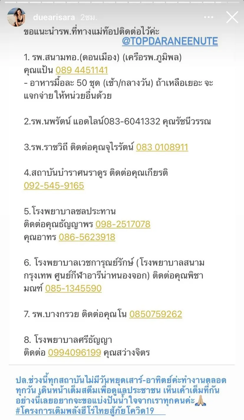 ล่าสุด เจ้าตัวได้มีการเป็นเจ้าภาพมื้ออาหาร ทั้ง 2 มื้อ ส่งไปยังโรงพยาบาล 320 แห่ง อีกทั้งยังเป็นกระบอกเสียงให้กับ #โครงการเติมพลังฮีโร่ไทยสู้ภัยโควิด19 อีกด้วย
