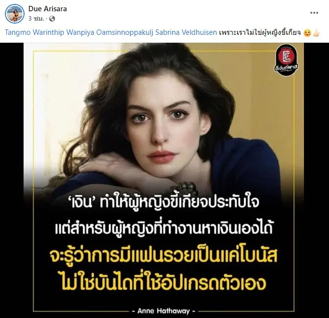 “เงิน’ ทำให้ผู้หญิงขี้เกียจประทับใจ แต่สำหรับผู้หญิงที่ทำงานหาเงินเองได้จะรู้ว่าการมีแฟนรวยเป็นแค่โบนัส ไม่ใช่บันไดที่ใช้อัพเกรดตัวเอง เพราะเราไม่ใช่ผู้หญิงขี้เกียจ พร้อมแท็กหาดาราสาวคนสนิท กวาง วรรณปิยะ งานี้แฟน ๆ ก็เข้ามาคอมเมนต์อย่างมากมาย