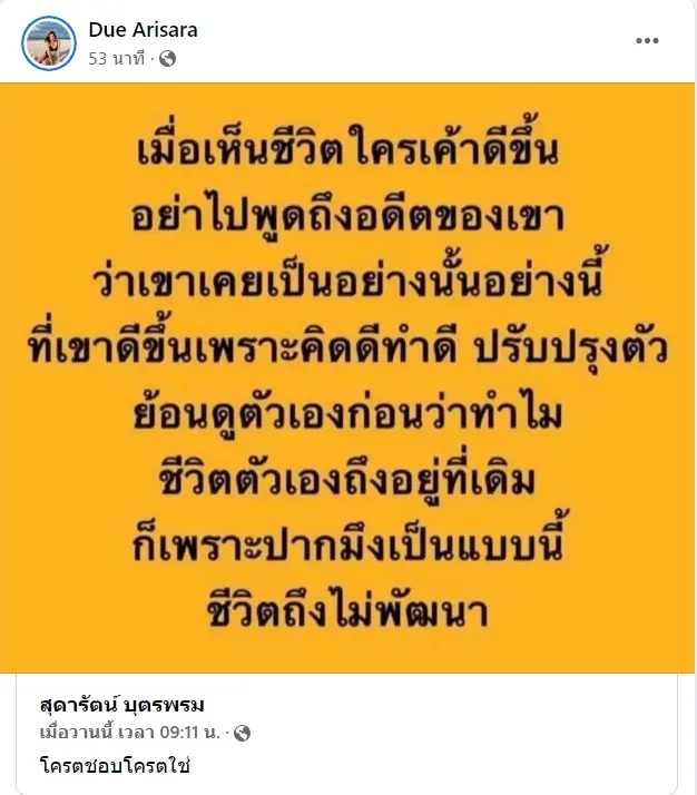 โดยต้นโพสต์จากตุ๊กกี้ ก็ได้บอกเอาไว้ว่า “โครตชอบโครตใช่” จนมีคนแชร์ออกไปกว่า 900 ครั้ง หนึ่งในนั้นก็คือว่าที่คุณแม่อย่าง ดิว อริสรา ก็แชรืโพสต์นี้ด้วยเช่นกัน เป็นโพสต์ที่ใช้ฟาดคนที่ชอบดูถูกความสำเร็จและอดีตของคนอื่น แต่ตัวเองไม่เคยพัฒนาได้เลยเพราะมีปากแบบนี้