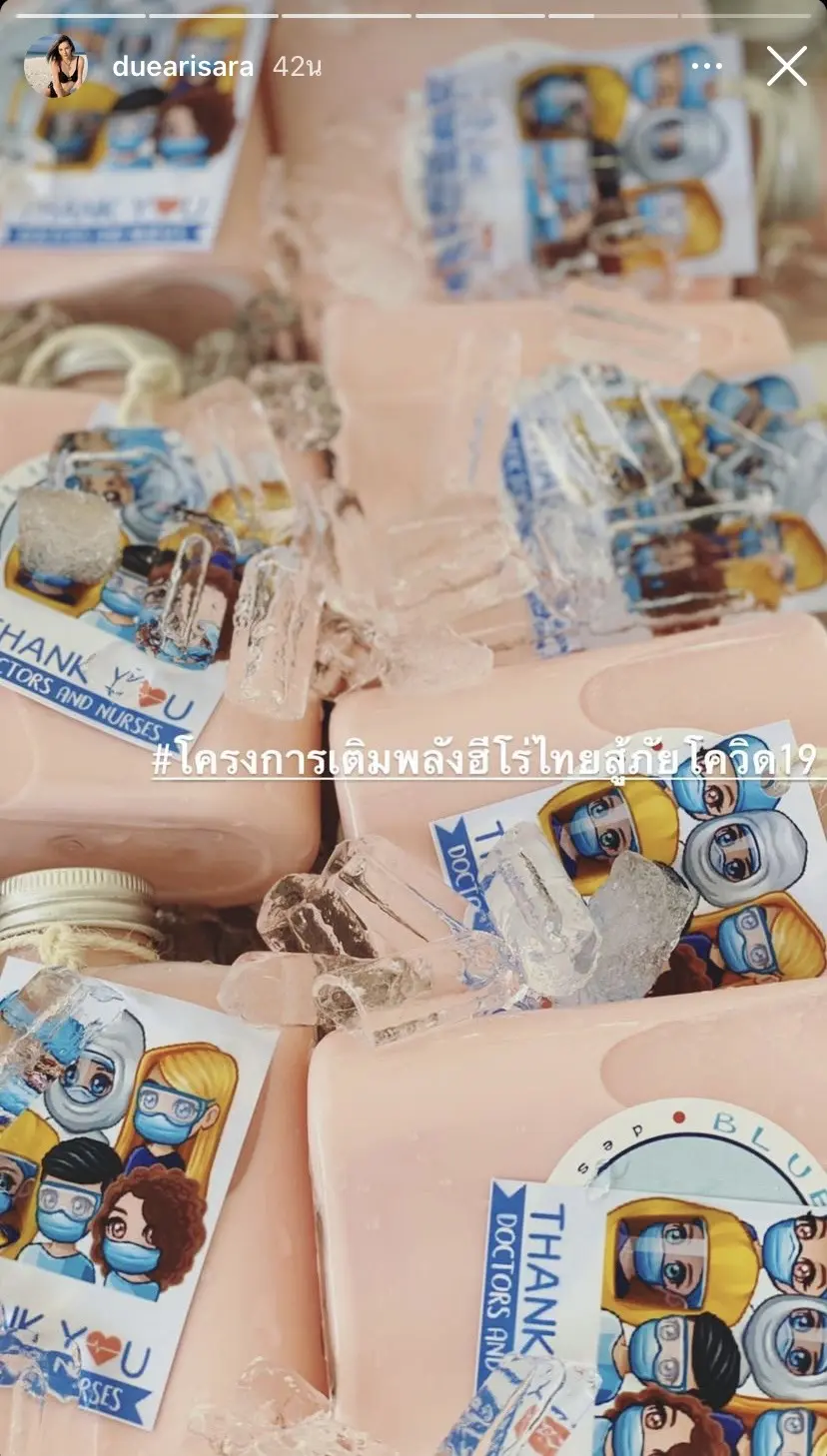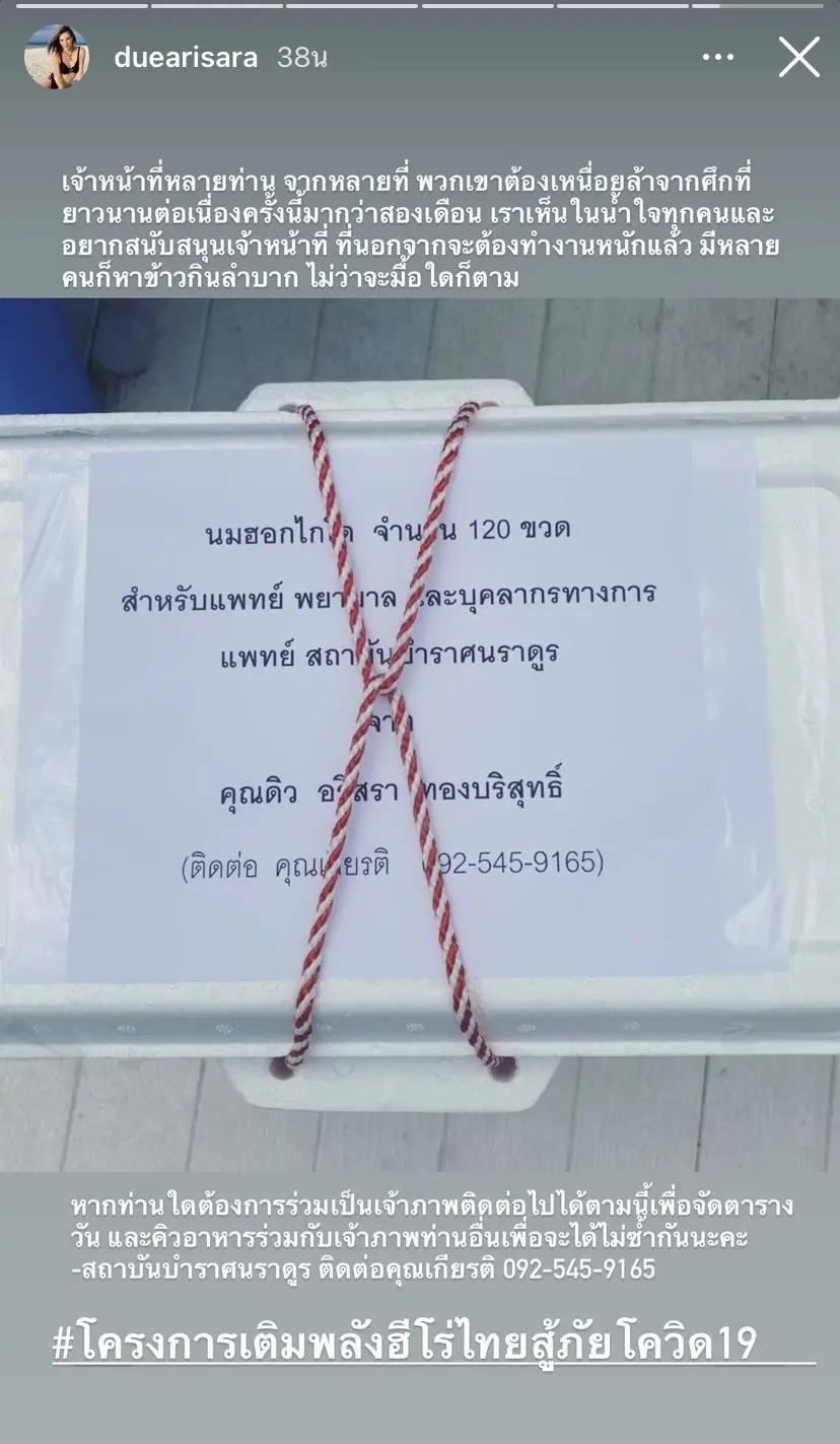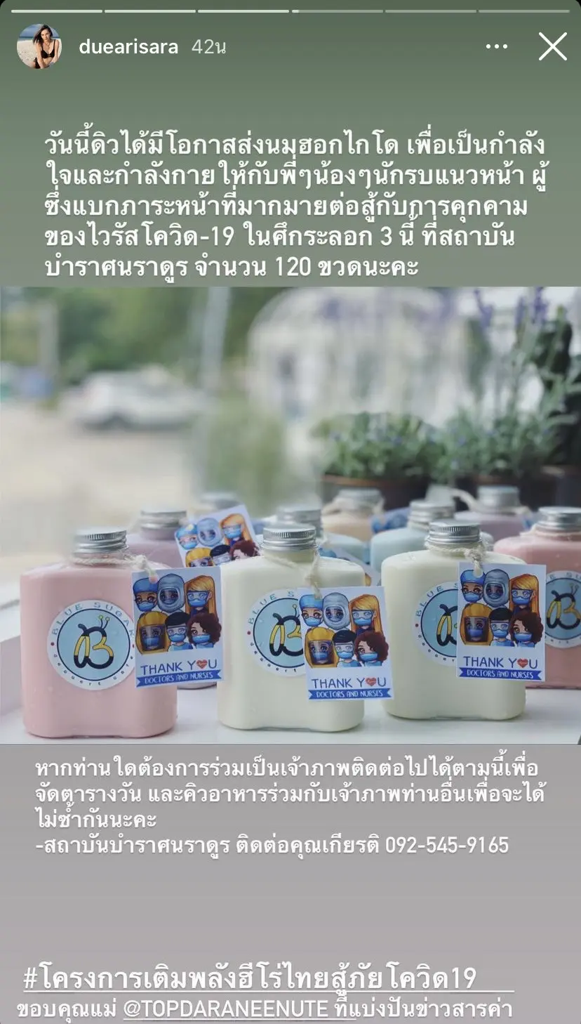รวมถึงนักแสดงสาวหน้าสวย ดิว อริสรา ขวัญใจของใครหลายๆคน ที่ได้ช่วยแบ่งเบาทีมแพทย์ด้วยการมอบนมฮอกไกโด เพื่อเป็นกำลังใจให้กับทีมแพทย์สถาบันบำราศนราดูร จำนวน 120 ขวด
