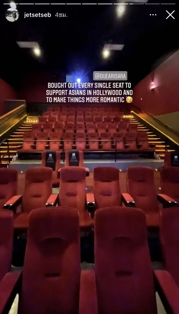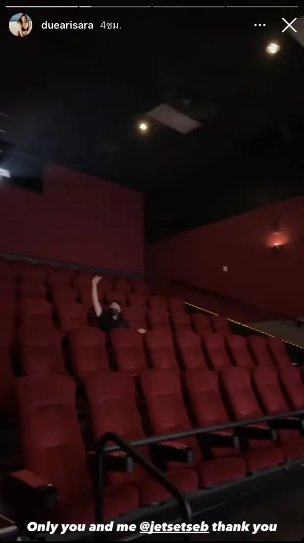 ล่าสุด ดิว อริสรา และแฟนหนุ่ม เซบาสเตียน ได้ออกมาอวดคลิปวิดีโอขณะที่กำลังจะรับชมภาพยนตร์ที่โรงหนังแห่งหนึ่ง แต่ที่ทำเอาแฟนๆต่างตาลุกวาวนั้นคือ หนุ่ม เซบาสเตียน ได้ทำการเหมาโรงหนังเพื่อมาสวีทกันสองต่อสอง แถมยังปลอดภัยจากเชื้อไวรัสโควิด-19ไปในตัวอีก!