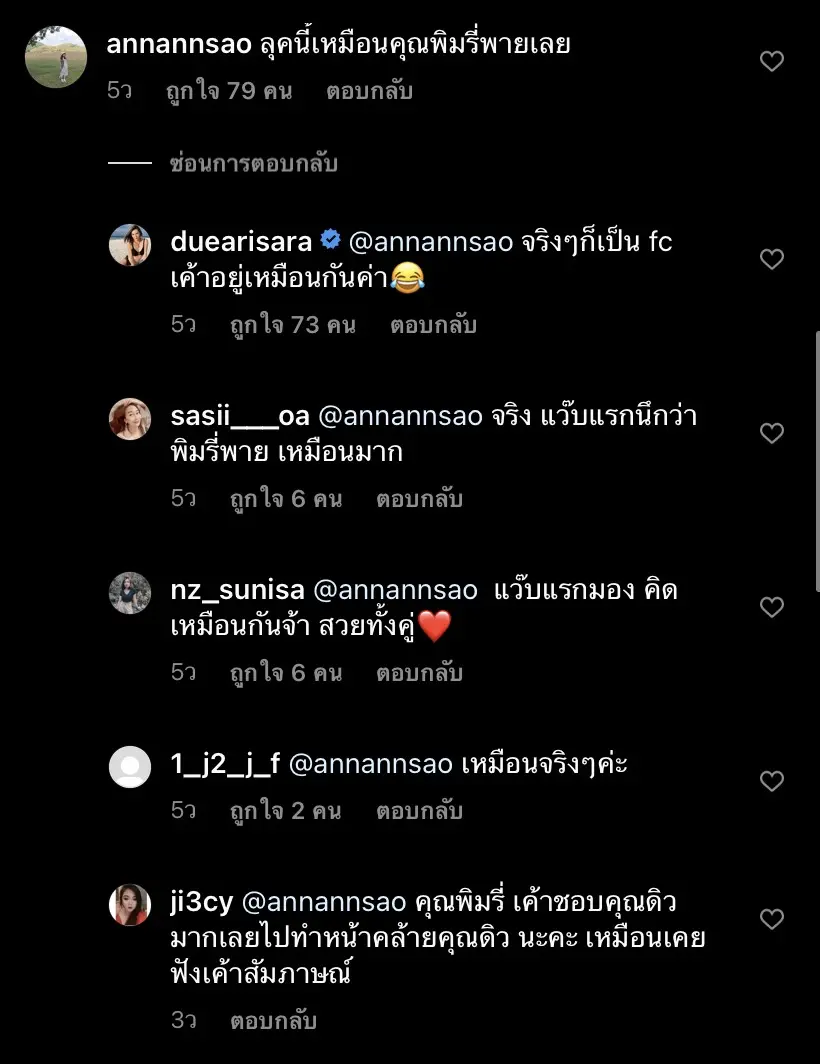 ล่าสุดก็เช่นกัน ดิว อริสรา ได้มีการโพสต์คลิปอวดความสวยผ่านทางอินสตาแกรม ซึ่งก็ได้มีชาวเน็ตเข้ามาคอมเมนต์ว่า “ลุคนี้เหมือนคุณพิมรี่พายเลย” สาวดิวจึงได้มีการตอบกลับไปว่า “จริงๆก็เป็น fc เค้าอยู่เหมือนกันค่า”