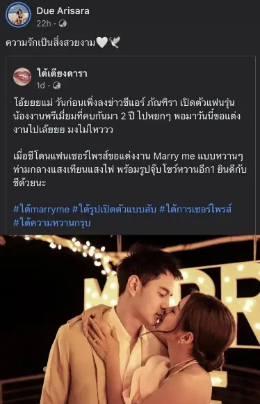 ดิว อริสรา — เรียกได้ว่าเป็นกระแสในโลกโซเชียลไม่น้อยหลัง แอร์ ภัณฑิลา ได้มีการออกมาเปิดตัวแฟนหนุ่มนอกวงการที่ชื่อ ไอซ์ หนุ่มหล่องานดี อีกทั้งยังโพสต์ภาพหลังฝ่ายชายทำการเซอร์ไพรส์ขอแต่งงาน พร้อมกับโชว์แหวนแต่งงาน อีกทั้งยังเป็นรูปคู่รูปแรกที่สาวแอร์ปล่อยออกมาให้พวกเราได้เห็นกันอีกด้วย