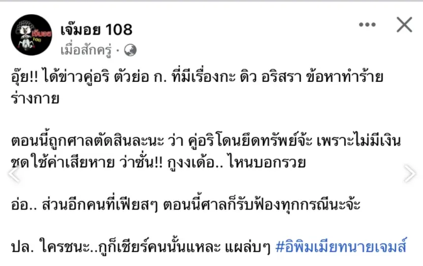 เพจเจ๊มอย108 โพสต์ข้อความความคืบหน้าคดีทำร้ายร่างกาย ดิว อริสรา ด้านคู่อริ ก.ไก่ โดนศาลสั่งยึดทรัพย์ เหตุไม่มีเงินชดใช้ค่าเสียหาย