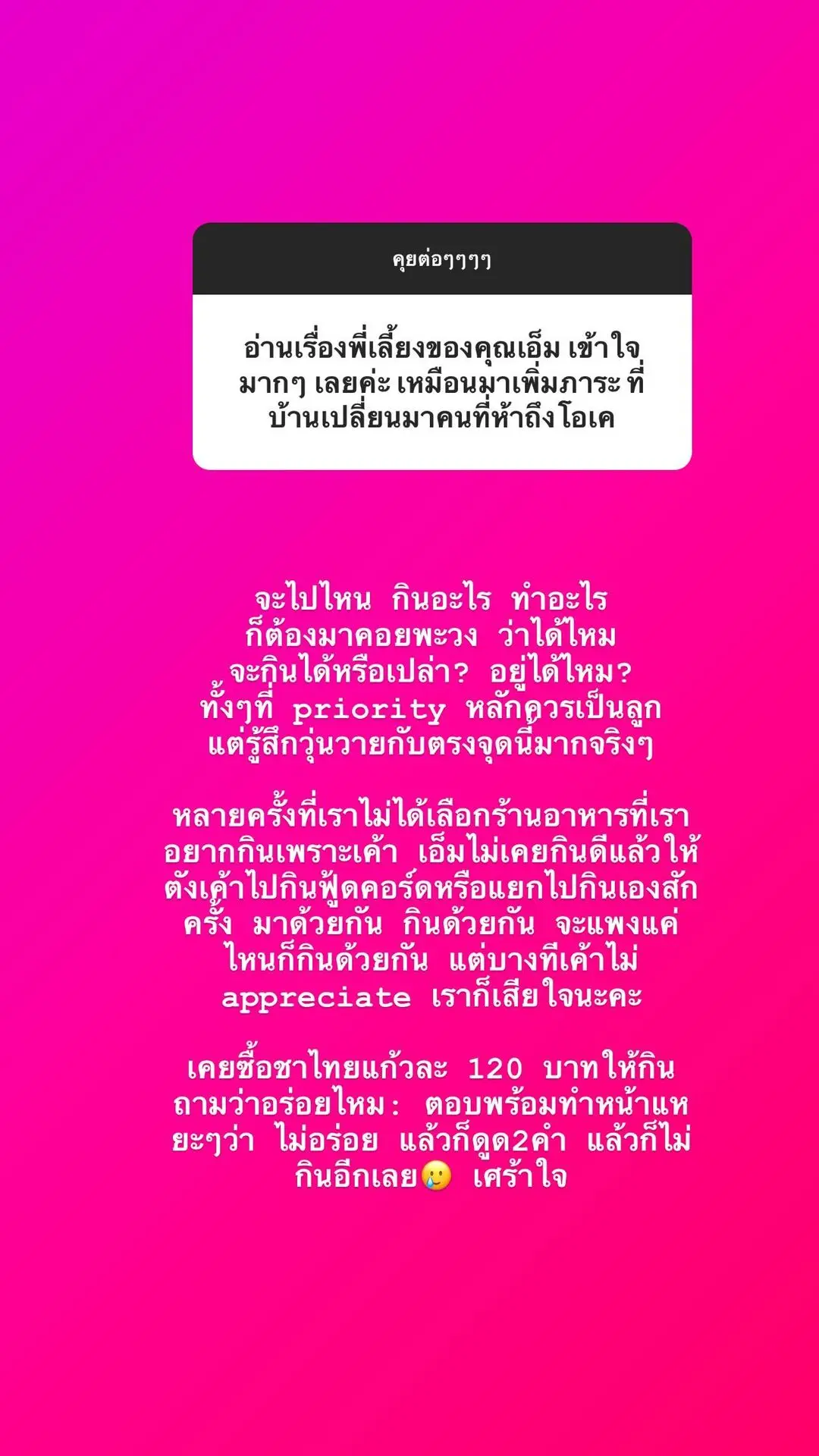 “หลายครั้งที่เราไม่ได้เลือกร้านอาหารที่เราอยากกินเพราะเขา เอ็มไม่เคยกินดีแล้วให้ตังค์เขาไปกินฟู้ดคอร์ดหรือแยกไปกินเองสักครั้ง มาด้วยกัน กินด้วยกัน จะแพงแค่ไหนก็กินด้วยกัน แต่บางทีเขาไม่ appreciate เราก็เสียใจนะคะ เคยซื้อชาไทยแก้วละ 120 บาทให้กิน ถามว่าอร่อยไหม ตอบพร้อมทำหน้าแหยะ ๆ ว่า ไม่อร่อย แล้วก็ดูด 2 คำ แล้วก็ไม่กินอีกเลย เศร้าใจ”