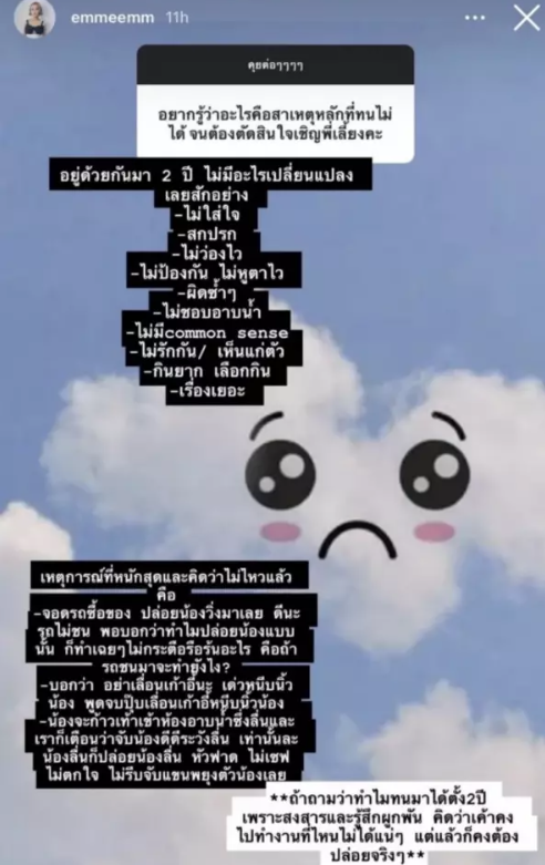 โดย เอ็ม บุษราคัม เผยว่า “อยู่ด้วยกันมา 2 ปี ไม่มีอะไรเปลี่ยนแปลงเลยสักอย่าง ไม่ใส่ใจ สกปรก ไม่ว่องไว ไม่ป้องกัน ไม่หูตาไว ผิดซ้ำ ๆ ไม่ชอบอาบน้ำ ไม่มี common sense ไม่รักกัน/เห็นแก่ตัว กินยาก เลือกกิน เรื่องเยอะ”