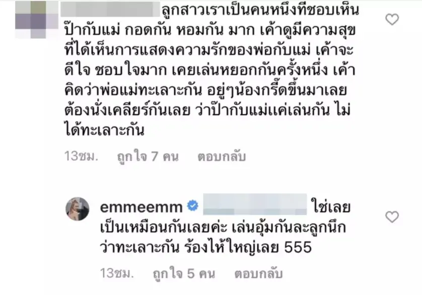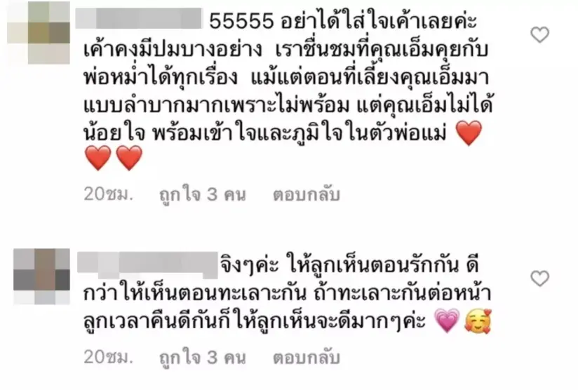 “55555 อย่าได้ใส่ใจเค้าเลยค่ะ เค้าคงมีปมบางอย่าง เราชื่นชมที่คุณเอ็มคุยกับพ่อหม่ำได้ทุกเรื่อง แม้แต่ตอนที่เลี้ยงคุณเอ็มมาแบบลำบากมากเพราะไม่พร้อม แต่คุณเอ็มไม่ได้น้อยใจ พร้อมเข้าใจและภูมิใจในตัวพ่อแม่”