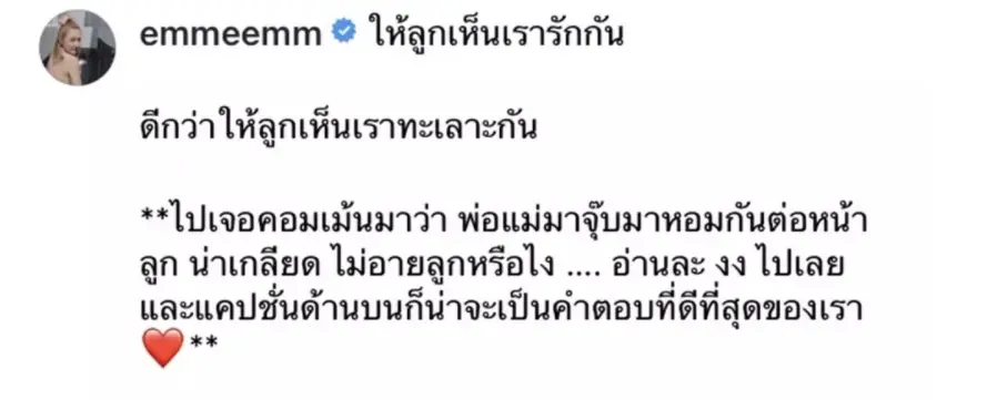 “ให้ลูกเห็นเรารักกัน ดีกว่าให้ลูกเห็นเราทะเลาะกัน **ไปเจอคอมเมนต์มาว่า พ่อแม่มาจุ๊บมาหอมกันต่อหน้าลูก น่าเกลียด ไม่อายลูกหรือไง …. อ่านละ งง ไปเลย และแคปชันด้านบนก็น่าจะเป็นคำตอบที่ดีที่สุดของเรา**”