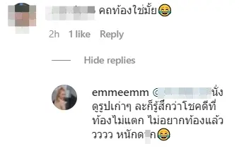 หลังจากนั้นไม่นาน ก็ได้มีแฟนคลับท่านหนึ่งเข้ามาคอมเมนต์ในโพสต์ดังกล่าวของเธอว่า คิดถึงท้องใช่ไหม? เอ็ม ตอบกลับคอมเมนต์ดังกล่าวอย่างทันทีว่า นั่งดูรูปเก่าๆ ละก็รู้สึกว่าโชคดีที่ท้องไม่แตก ไม่อยากท้องแล้ววววว หนักด*ก