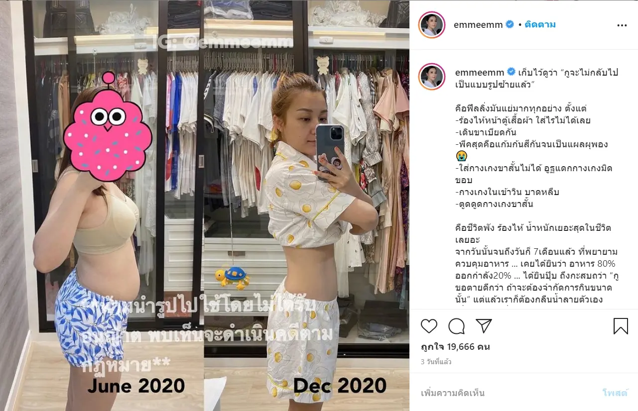 โดยเอ็ม ได้ออกมาโพสต์ข้อความผ่านอินสตาแกรม เผยเรื่องราวต่างๆภายใน 7 เดือน น้ำหนักก็ลดลงไปเกือบ 10 กิโลกรัม ด้วยความภาคภูมิใจ ระบุว่า”เก็บไว้ดูว่า “กูจะไม่กลับไปเป็นแบบรูปซ้ายแล้ว”