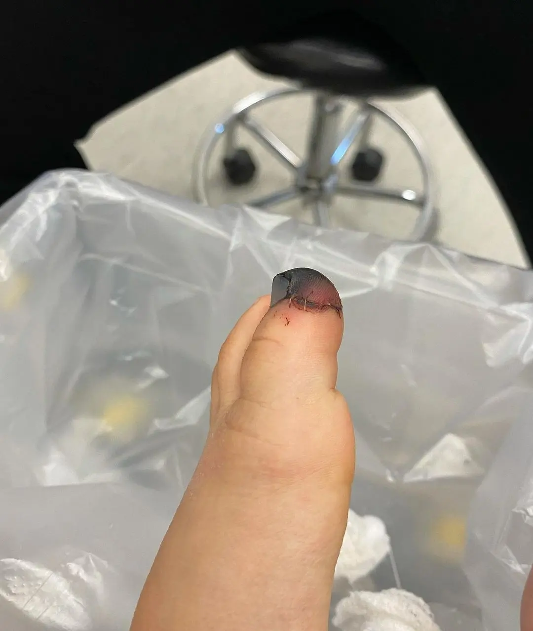 รูปที่ 4 เล็บที่คุณหมอแปะไว้ให้เพื่อปกป้องกระดูกและผิวจากการโดนสิ่งอื่นๆ จู่ๆก็หลุดเอง เพราะเล็บจริงเกิดใหม่และดันตัวเล็บที่แปะไว้จนหลุดออก (น้องไม่เจ็บเลย เพราะไม่รู้ตัวด้วยซ้ำว่าหลุด555)