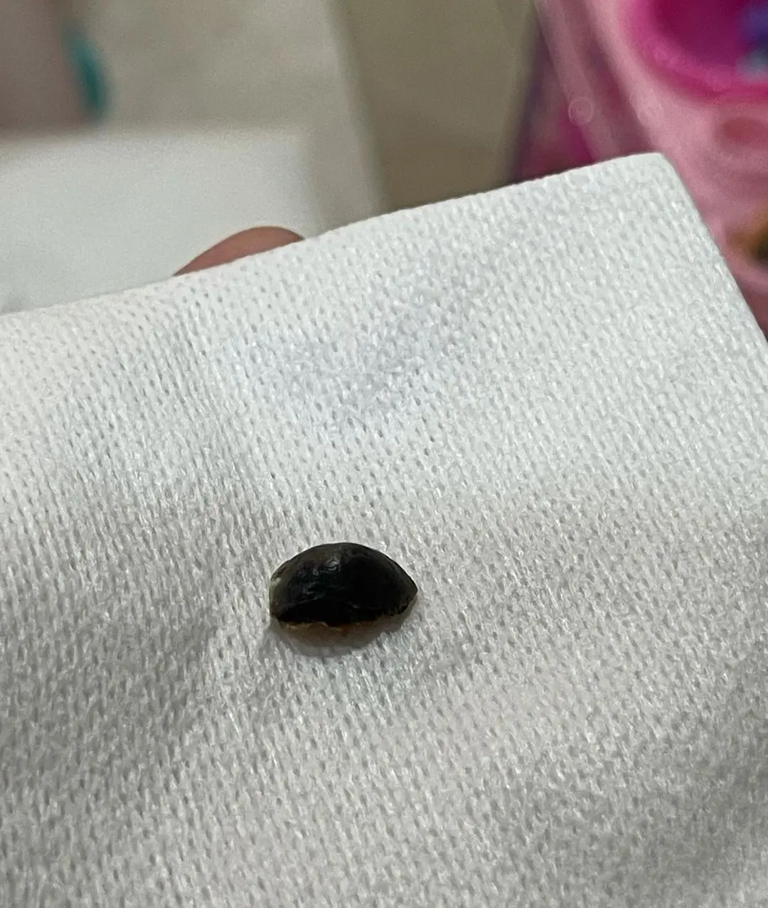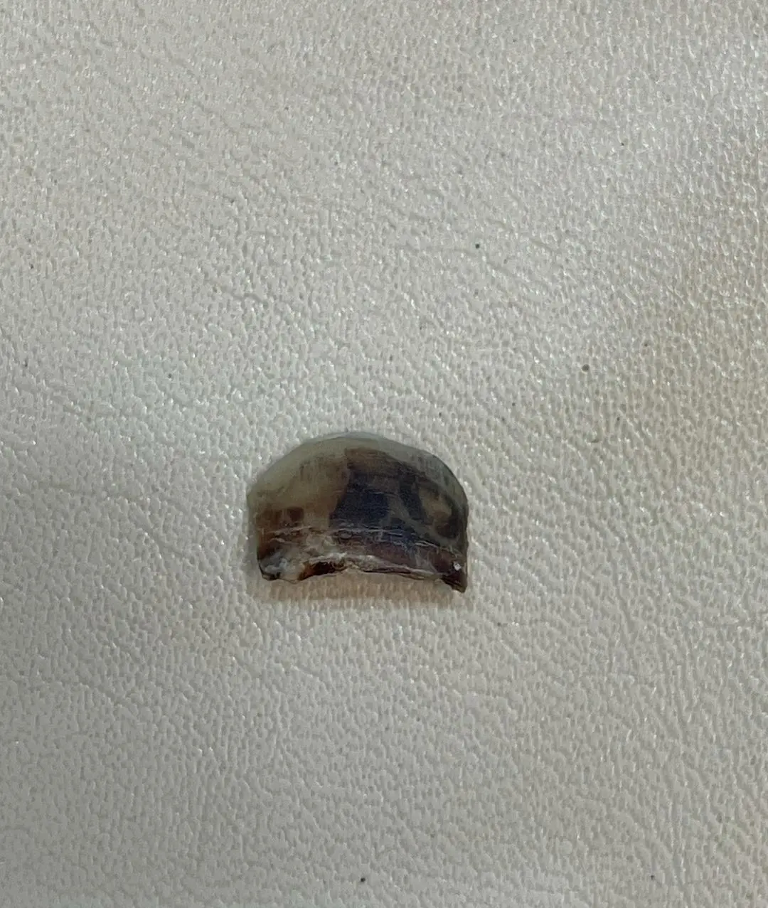 รูปที่ 5 ส่วนที่เป็นเนื้อตายหลุดออกมาเองโดยที่ตัวน้องเองก็ไม่รู้ตัว หม่าม้าก็ไม่รู้ ต้องไปเดินตามหาซากกัน เนื้อตายส่วนนี้เป็นส่วนที่น่ากังวลและต้องเฝ้าระวัง จริงๆ ต้องคอยเล็มตัดออกตลอดเพราะเนื้อเกิดใหม่จะค่อยๆ ดันจนหลุดลอก แต่หากไม่ยอมลอกเองก็ต้องดมยาสลบแล้วผ่าตัดลอกตัดออก ซึ่งโชคดีมากกกกกกกที่มันหลุดเอง