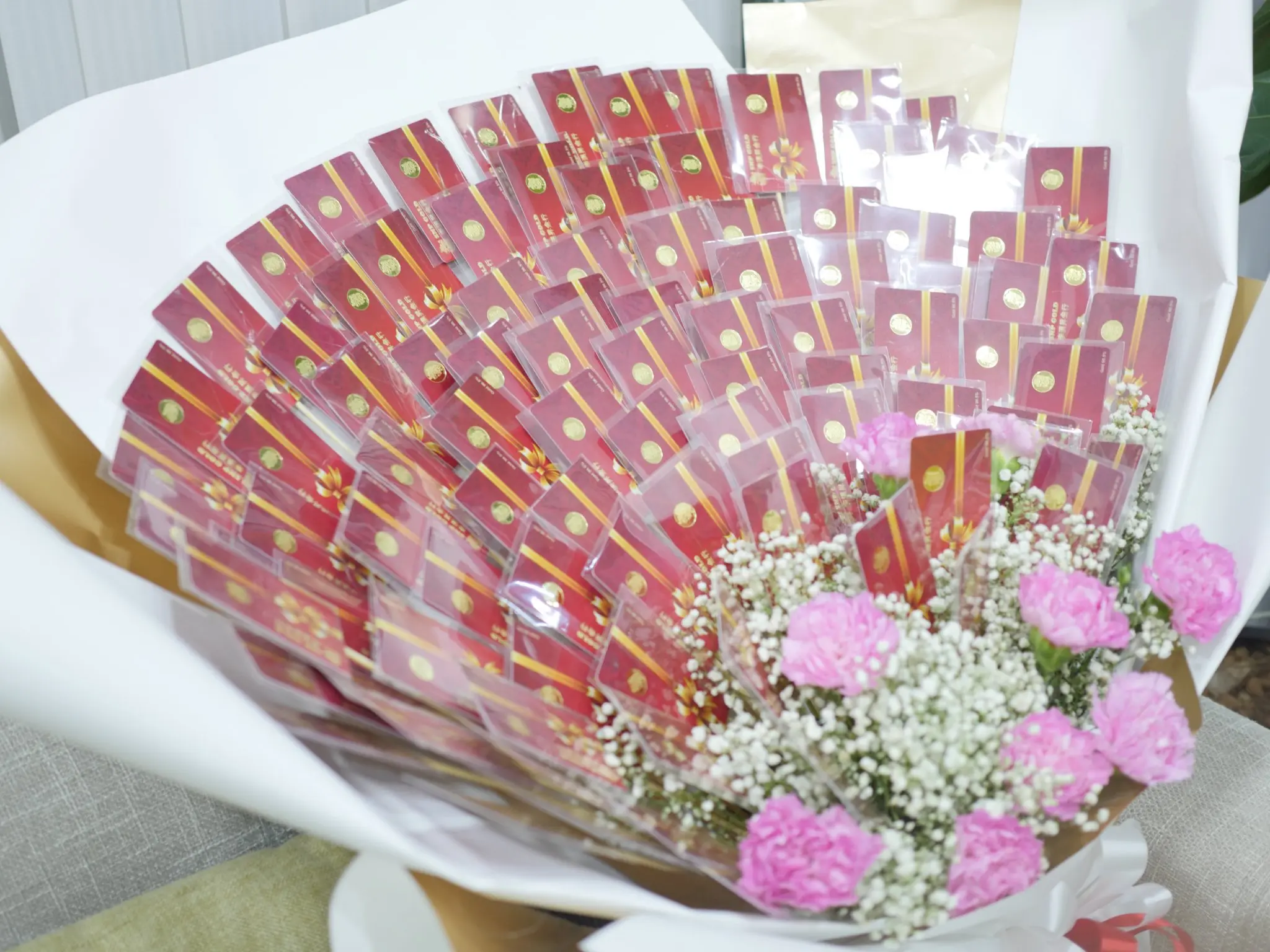 “ขอแสดงความยินดีกับทั้งคู่ อิงล็อต ในการประสบความสำเร็จอีก 1 ขั้น ด้วยน้ำพักน้ำแรง ความขยัน และความกตัญญู แม่ออน ขอมอบอาคารพาณิชย์พร้อมโฉนด คนละ 1 คูหา สร้อยคอทองคำแท้ น้ำหนัก 1 บาท คนละ 1 เส้น ช่อดอกไม้ทองคำแท่ง 100 แท่ง คนละ 1 ช่อ สร้อยข้อมือปี่เซียะทองคำแท้ 1 เส้น คนละ 1 เส้น รวมมูลค่ากว่า 6 ล้านบาท”