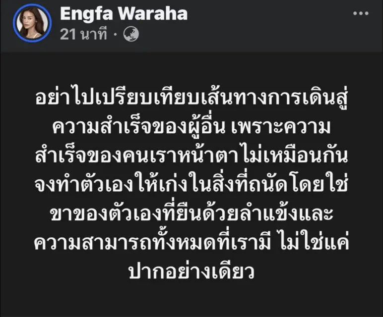 “อย่าไปเปรียบเทียบ ความสำเร็จของผู้อื่น เพราะความสำเร็จของคนเราหน้าตาไม่เหมือนกัน จงทำตัวเองให้เก่งในสิ่งที่ถนัด โดยใช้ขาของตัวเองยืนด้วยลำแข้ง และความสามารถทั้งหมดที่เรามี ไม่ใช่แค่ปากอย่างเดียว”