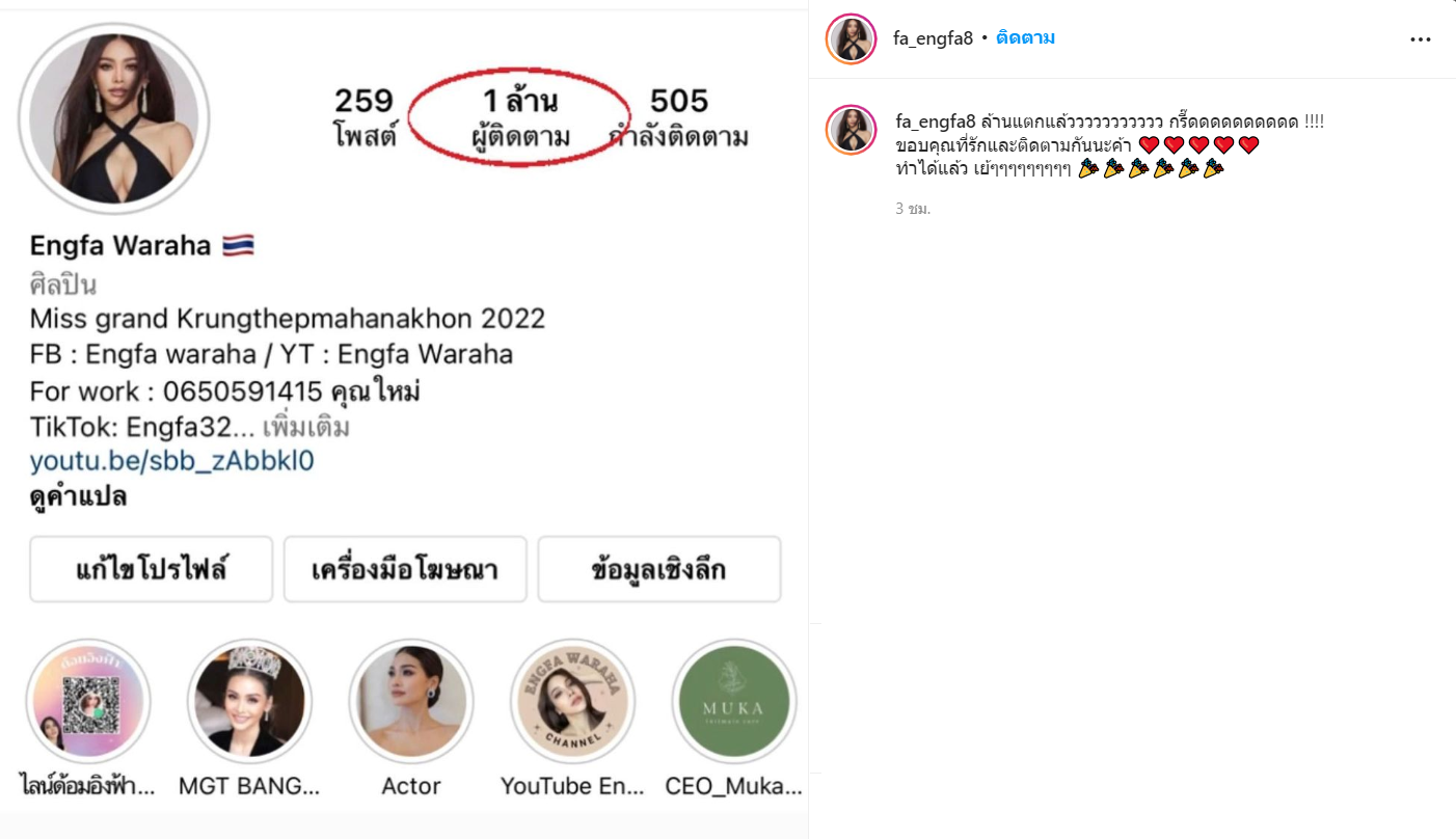 อิงฟ้า วราหะ มิสแกรนด์กรุงเทพมหานคร เกินต้าน! หลังมีผู้ติดตามบัญชีอินสตาแกรมครบ 1 ล้านคนเป็นที่เรียบร้อย เจ้าตัวลั่น ทำได้แล้ว