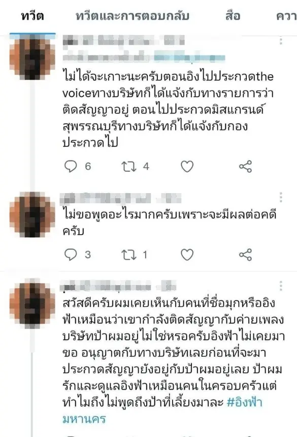 โดยแฟนนางงามที่เห็นโพสต์ดังกล่าวต่างก็พูดเป็นเสียงกันว่า สัญญา 12 ปีฟังดูเกินจริง ค่ายเพลงที่ดังและใหญ่กว่าเต็มที่ก็ 3-5 ปี อีกทั้งระหว่างที่เซ็นสัญญาก็ไม่ได้มีการป้อนงานให้เท่าที่ควร บางส่วนก็บอกว่า ทำไมค่ายเพลงถึงเลือกที่จะออกมาเคลื่อนไหวหลังการประกวดจบลงแล้ว และครั้งที่อิงฟ้าเคยลงประกวดร้องเพลงในรายการหนึ่งทำไมถึงลงได้ ทั้งที่มีกติการะบุอยู่อย่างชัดเจน