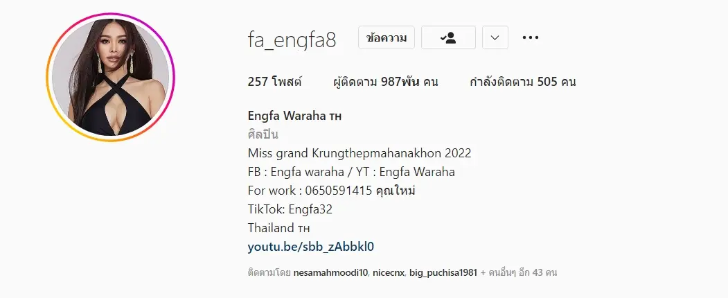 อิงฟ้า วราหะ มิสแกรนด์กรุงเทพมหานคร เตรียมนับถอยหลังยอดคนฟอลโลในอินสตาแกรม ใกล้ทะลุ 1 ล้าน ก่อนถึงวันประกาศผลรอบชิง 30 เมษยน นี้!