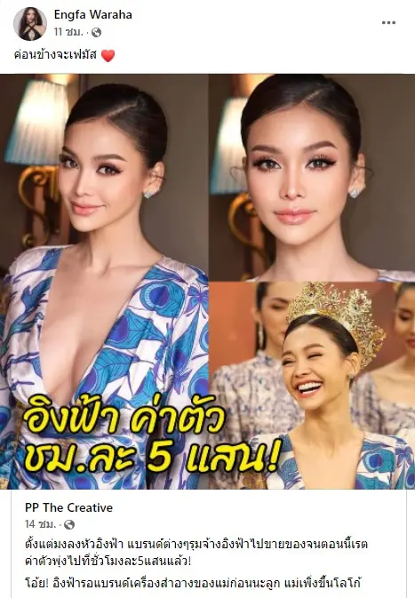 เรียกว่าปังไม่ไหวหลังมงลงค่าตัวพุ่งปรี๊ดสูงถึง 6 หลัก ทั้งยังลูกค้ารุมจีบอีกมากมายหลายแบรนด์ รวมถึงงานละครก็แว่ว ๆ มาว่ามีติดต่อมาแล้วสำหรับ อิงฟ้า วราหะ มิสแกรนด์ไทยแลนด์ 2022 โดยเพจดังอย่าง PP The Creative ได้เผยว่า ตั้งแต่มงลงหัวอิงฟ้า แบรนด์ต่างๆรุมจ้างอิงฟ้าไปขายของจนตอนนี้เรตค่าตัวพุ่งไปที่ชั่วโมงละ5แสนแล้ว!โอ้ย! อิงฟ้ารอแบรนด์เครื่องสำอางของแม่ก่อนนะลูก แม่เพิ่งขึ้นโลโก้