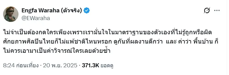 “ไม่จำเป็นต้องกดใครเพียงเพราะเรามั่นใจในมาตรฐานของตัวเองที่ไม่รู้ถูกหรือผิด… ศักยภาพศิลปินไทยก็ไม่แพ้ชาติไหนหรอก ดูกันที่ผลงานดีกว่า และคำว่า ‘พื้นบ้าน’ ก็ไม่ควรเอามาเป็นคำวิจารณ์ใครเลยด้วยซ้ำ”