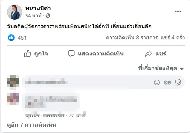 ด้าน จั๊กจั่น จะมอบหมายให้ทนายนิด้าจัดการเรื่องทั้งหมด โดยทนายนิด้าได้โพสต์ข้อความว่า “จับอดีตผู้จัดการดาราพร้อมเพื่อนสนิทได้สักที เลื่อนแล้วเลื่อนอีก”
