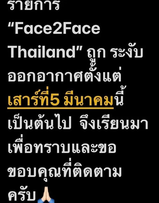 ล่าสุด คุณเต้ กันตนา ได้มีการเคลื่อนไหวอีกครั้งผ่านทางอินสตาแกรม พร้อมข้อความว่า รายการ Face 2 Face Thailand ถูกระงับออกอากาศตั้งแต่เสาร์ที่ 5 มีนาคม นี้ เป็นต้นไป จึงเรียนมาเพื่อทราบและขอขอบคุณที่ติดตามครับ