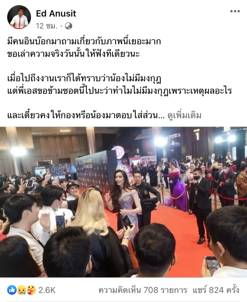 จากนั้นน้องก็ได้ออกไปถ่ายรูปกับแฟนคลับแบบในภาพที่ทุกคนเห็น โดยมีสตาฟท่านนึงเดินถือกล่องมงกุฎประกบน้องตลอดเวลา และคอยบอกน้องว่าหมดเวลาแล้ว ตอนนั้นพี่เอสได้แต่สงสารน้องจับใจเลยแต่ก็ทำอะไรไม่ได้ เพราะน้องอยากถ่ายรูปกับแฟนคลับให้นานที่สุดกับมงกุฎบนหัว พี่เอสก็เข้าใจว่าสตาฟเขาก็ทำหน้าที่ของเขา แต่เราอดสงสารน้องเราไม่ได้ สุดท้ายน้องก็มาถอดมงกุฎให้สตาฟท่านนั้นไปในห้องแต่งตัว นี่คือความจริงทั้งหมดในวันนั้นทั้งหมดว่าเกิดอะไรขึ้น จะได้ไม่ต้องคาดเดาอะไร ส่วนเรื่องที่ทุกคนอยากรู้ จะมาเล่าให้ฟังเร็วเร็วนี้นะเพราะทุกอย่างต้องกลั่นกรองเพื่อไม่ให้กระทบกระทั้งพาดพิงใครในทางเสียหาย อยู่บนความจริงทางกฎหมายมากที่สุด”
