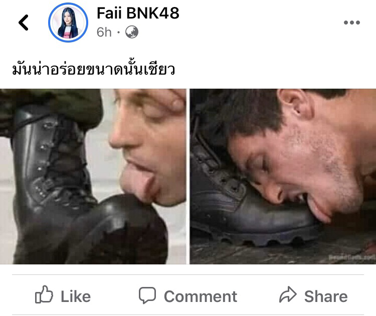 ล่าสุด หลังจากที่ได้มีเหตุการณ์ตำรวจบุกจับประชาชนที่ไปร่วมเขียนป้ายผ้าบอกเล่าความในใจกับความล้มเหลวในการบริหารหารจัดการของรัฐบาลประยุทธ์ จันทร์โอชา โดยใช้ชื่อในกิจกรรม ” 112 เมตรกับความทุเรศของรัฐบาล” ที่บริเวณเกาะพญาไท อนุสาวรีชัยสมรภูมิ จนก่อให้เกิดความไม่พอในต่อการทำหน้าที่ของทางตำรวจ ทางด้านสาวฝ้ายเองก็ไม่ได้น่อยหน้า เธอได้มาโพสต์รูปคนเลียรองเท้าลงในเฟสบุ๊คของเธอ พร้อมกับแคปชั่นว่า ”มันน่าอร่อยขนาดนั้นเชียว”