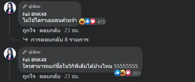 เป็นอีกหนึ่งไอดอลหญิงที่มาพร้อมกับความน่ารัก สำหรับ ฝ้าย BNK48 ล่าสุด ได้มีการออกมาประกาศผ่านทางเฟซบุ๊ก Faii BNK48 ว่า “เปลี่ยนชื่อจริงจาก สุมิตรา เป็น สุมิตตา แล้วนะฮะ