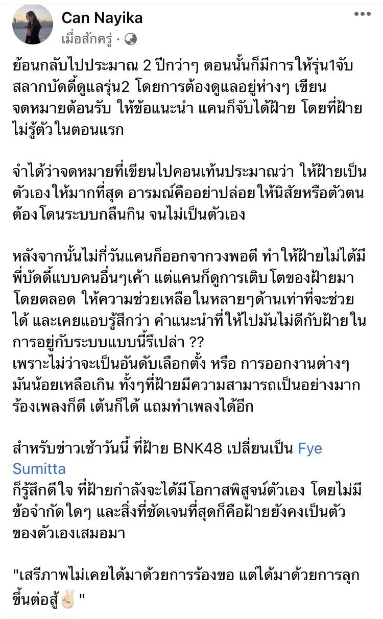 ซึ่งล่าสุด แคน นายิกา อดีต เมมเบอร์ BNK 48 ที่ออกจากวงไปก่อนหน้านี้ ได้ออกมาโพสต์ข้อควยามผ่านเฟซบุ๊กส่วนตัว Can Nayika ถึงกรณีของฝ้ายหลังทราบข่าวออกจากวงอย่างกะทันหัน โดยระบุว่า