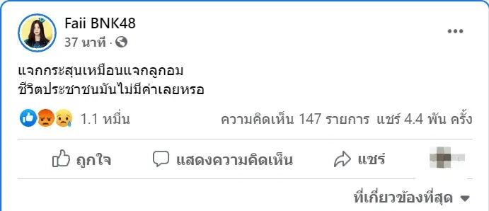 โดยล่าสุด ฝ้าย ได้ออกมาโพสต์ข้อความผ่านโซเชียลของเธอ โดยระบุว่า “แจกกระสุนเหมือนแจกลูกอม