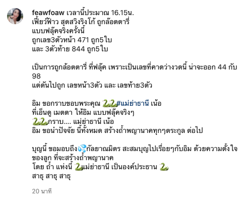 โดยเจ้าตัวโพสต์ภาพพร้อมแคปชั่นว่า เวลานี้ประมาณ 16.15น. เฟี้ยว์ฟ้าว สุดสวิงริงโก้ ถูกลอตเตอรี่ แบบฟลุ๊คจริงครั้งนี้ ถูกเลข3ตัวหน้า 471 ถูก5ใบ และ 3ตัวท้าย 844 ถูก5ใบ