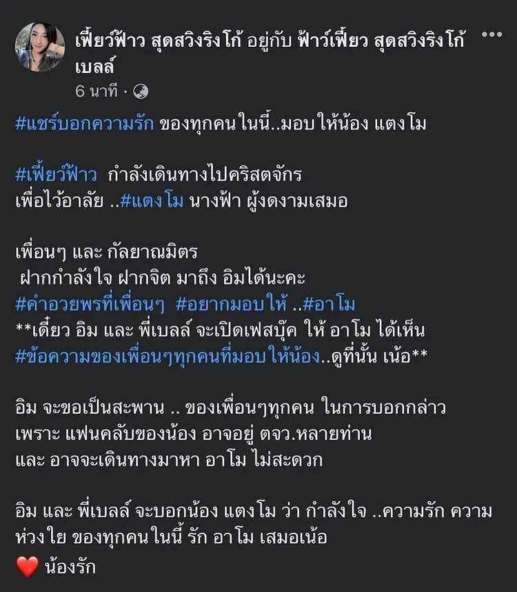 ‘เพื่อน ๆ และกัลยาณมิตร ฝากกำลังใจ ฝากจิตมาถึงอิมได้นะคะ คำอวยพรที่เพื่อน ๆ อยากมอบให้อาโม เดี๋ยวอิมและพี่เบลล์จะเปิดเฟซบุ๊กให้อาโมได้เห็นข้อความของเพื่อน ๆ ที่มอบให้น้องดูที่นั่นเน้อ‘